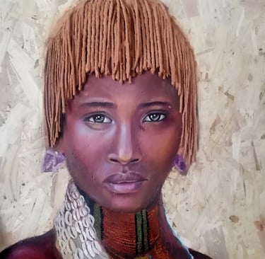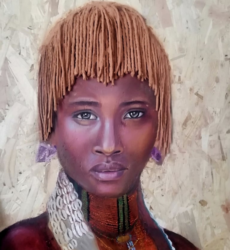 Nombre de la Obra: Tribu Hamer Tamaño en centímetros: 62x68 cm Breve descripción: técnica mixta, con materiales reciclados sobre tablero OSB.
