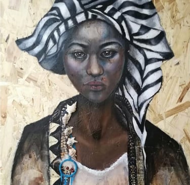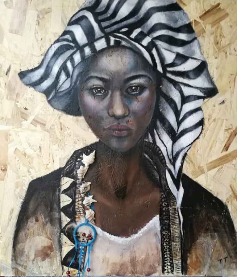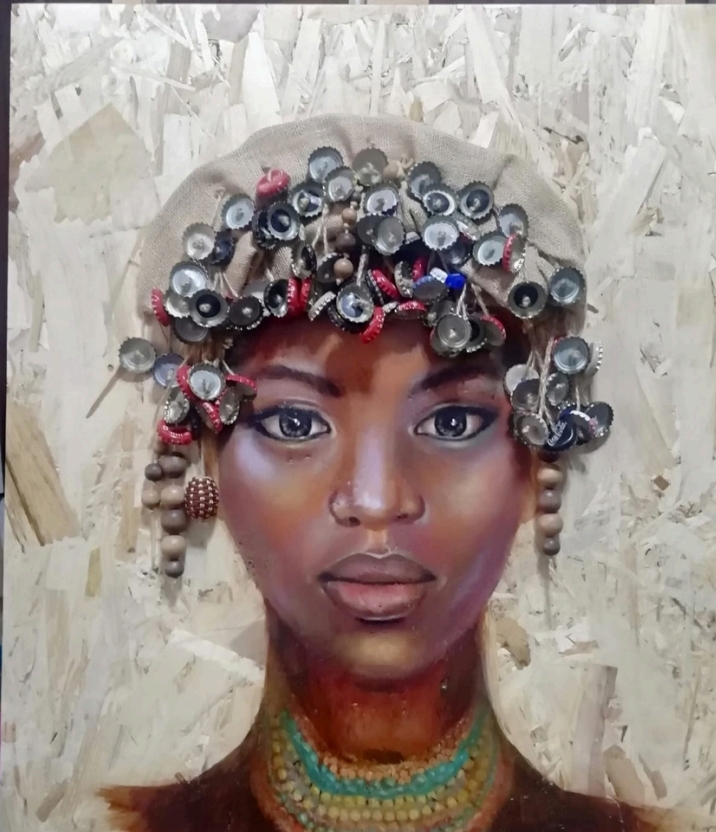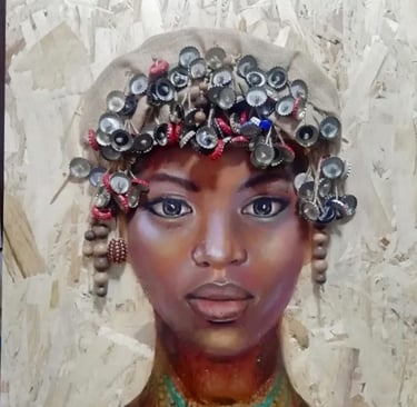 Nombre de la Obra: africana Tamaño en centímetros: 62x68 cm Breve descripción: técnica mixta, con materiales reciclados sobre tablero OSB