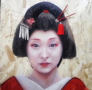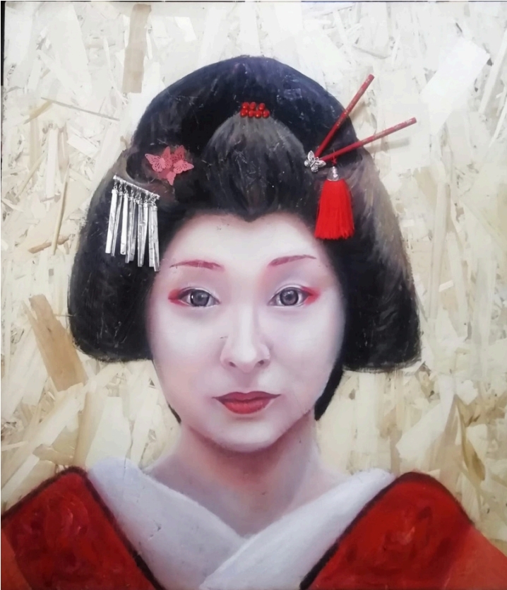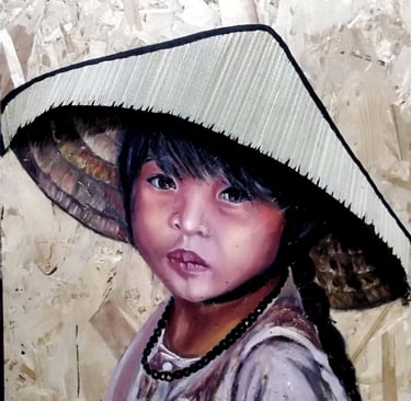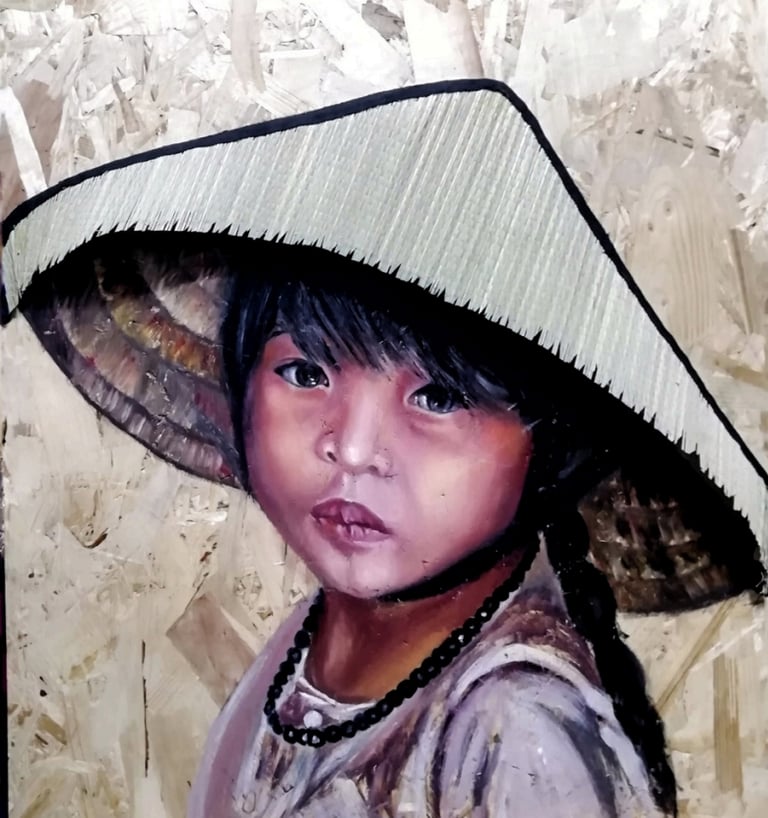 Nombre de la Obra: Vietnamita Tamaño en centímetros: 62x68 cm Breve descripción: técnica mixta, con materiales reciclados sobre tablero OSB