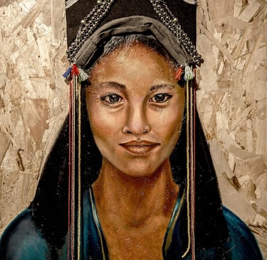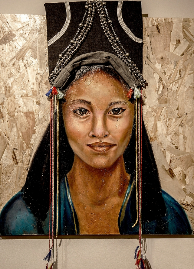Nombre de la Obra: Tribu Akha Tamaño en centímetros: 62x68 cm Breve descripción: técnica mixta, con materiales reciclados sobre tablero OSB