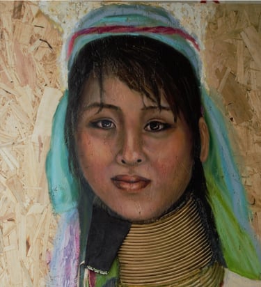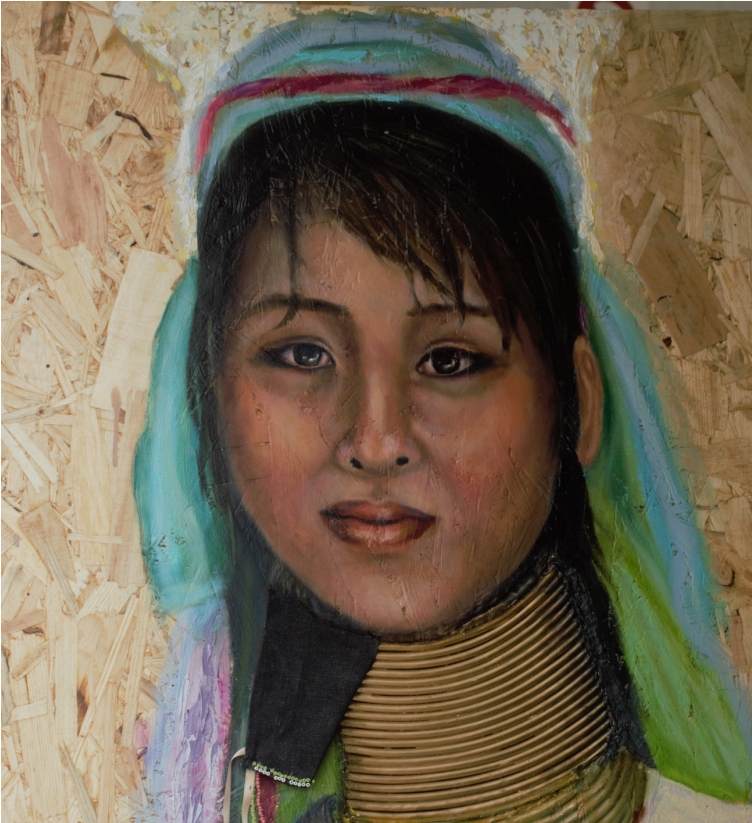Nombre de la Obra: Tribu Yan Pa Doung Tamaño en centímetros: 62x68 cm Breve descripción: técnica mixta, con materiales reciclados sobre tablero OSB