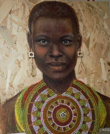 Nombre de la Obra: Tribu Masai Tamaño en centímetros: 62x68 cm Breve descripción: técnica mixta, con materiales reciclados sobre tablero OSB