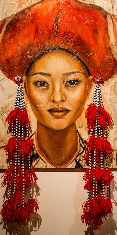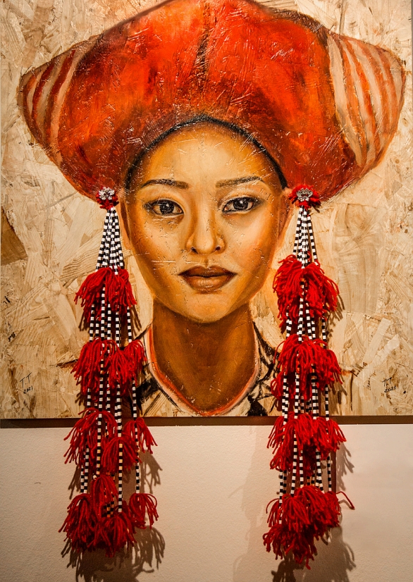Nombre de la Obra: Tribu Red Dao Hill Tamaño en centímetros: 62x68 cm Breve descripción: técnica mixta, con materiales reciclados sobre tablero OSB
