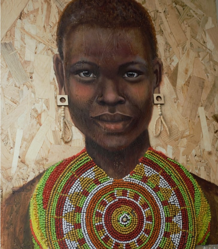 Nombre de la Obra: Tribu Daasanach Tamaño en centímetros: 62x68 cm Breve descripción: técnica mixta, con materiales reciclados sobre tablero OSB